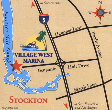 | By Land Village West Marina is conveniently located and easy to find. Take I-5 to Northern Stockton and exit on Benjamin Holt Drive. Turn west onto Benjamin Holt Drive and follow approximately 1-1/2 miles, until you see the large sign at the entrance to Village West Marina on your right.